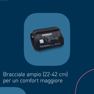 Il bracciale universale (22–42 cm) si adatta facilmente a diverse conformazioni del braccio e assicura risultati accurati in qualsiasi posizione attorno alla parte superiore del braccio. Il rilevamento del battito cardiaco irregolare e dei movimenti corporei contribuisce a ridurre gli errori, migliorando l’affidabilità delle letture.