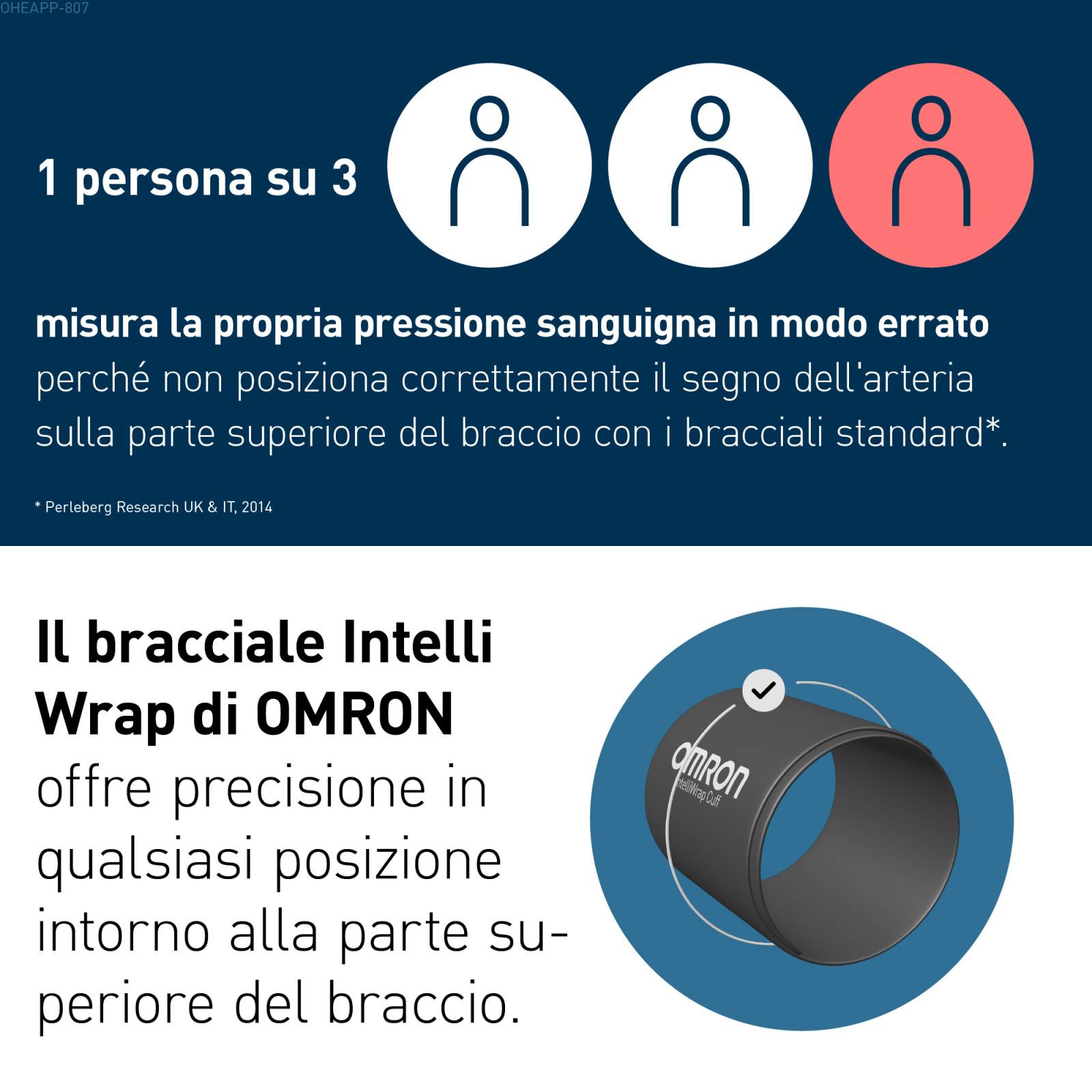 Il dispositivo integra il bracciale Intelli Wrap da 22–42 cm, che assicura misurazioni precise in qualsiasi posizione venga posizionato attorno al braccio. In questo modo si elimina il rischio di errori legati a un posizionamento scorretto del bracciale, rendendolo ideale anche per chi è alle prime armi.